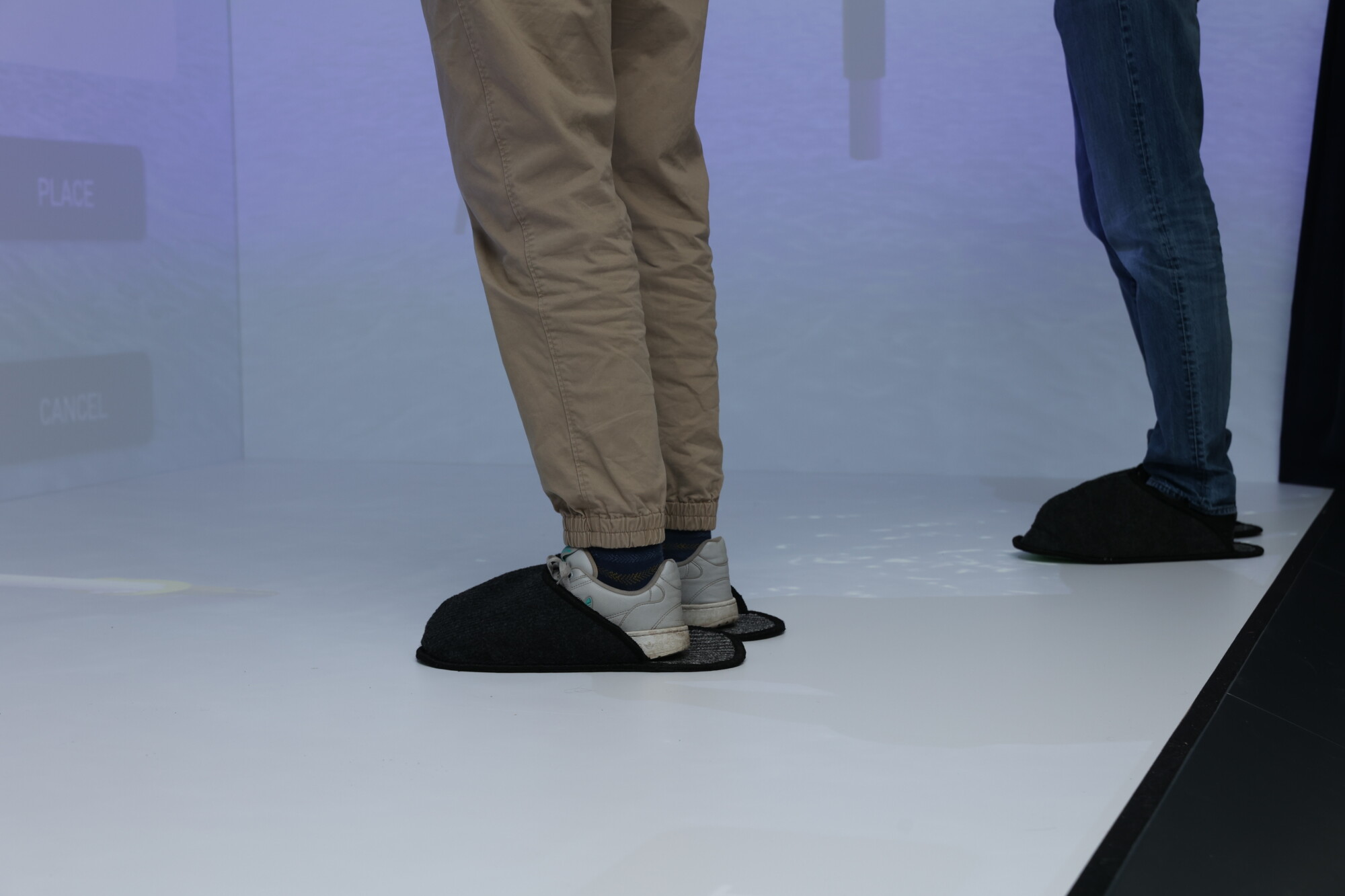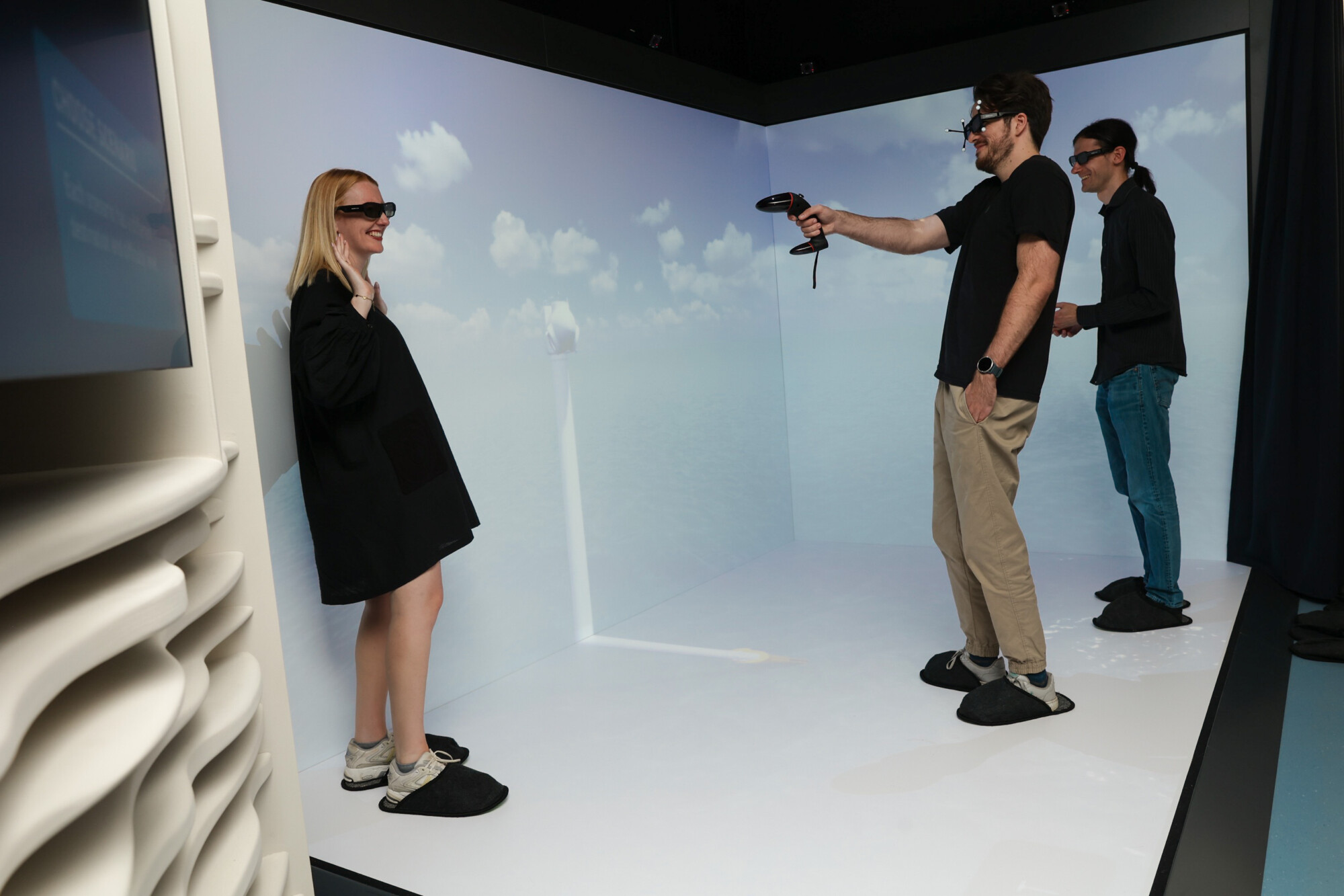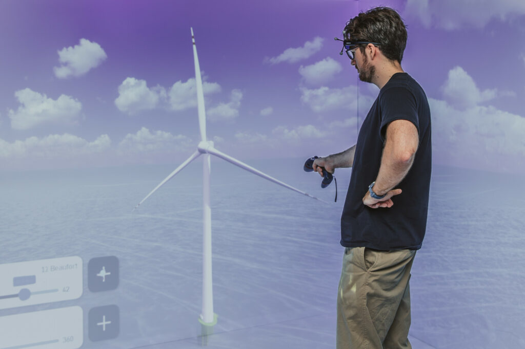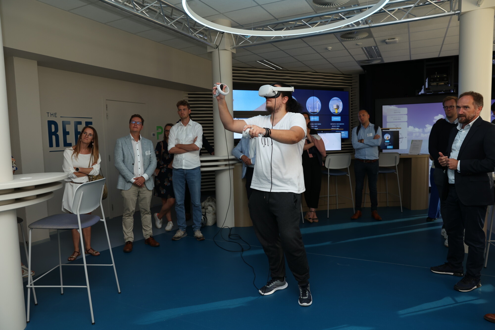 The showpiece of The Reef’s training infrastructure is big, literally. A VR Cave is an application where you stand in a virtual world without having to wear Virtual Reality glasses. The walls and floor transform into projection screens that take you on an immersive tour of wind farms, all the way to the bottom of the sea. Thanks to stereoscopic glasses, you can walk among the anemones on the seabed yourself. And then the interactive adventure begins: building a wind turbine.